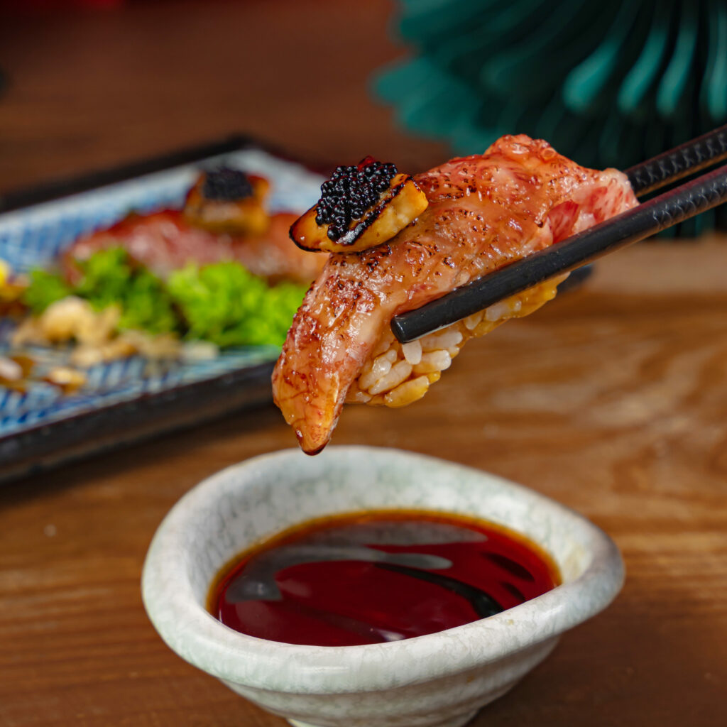 Nigiri Wagyu Nhật A5 Gan ngỗng Pháp hảo hạng: Sự kết hợp giữa vân mỡ đặc trưng của bò Wagyu A5 và gan ngỗng Pháp tạo nên một cảm giác mềm mượt, tan chảy ngay đầu lưỡi.