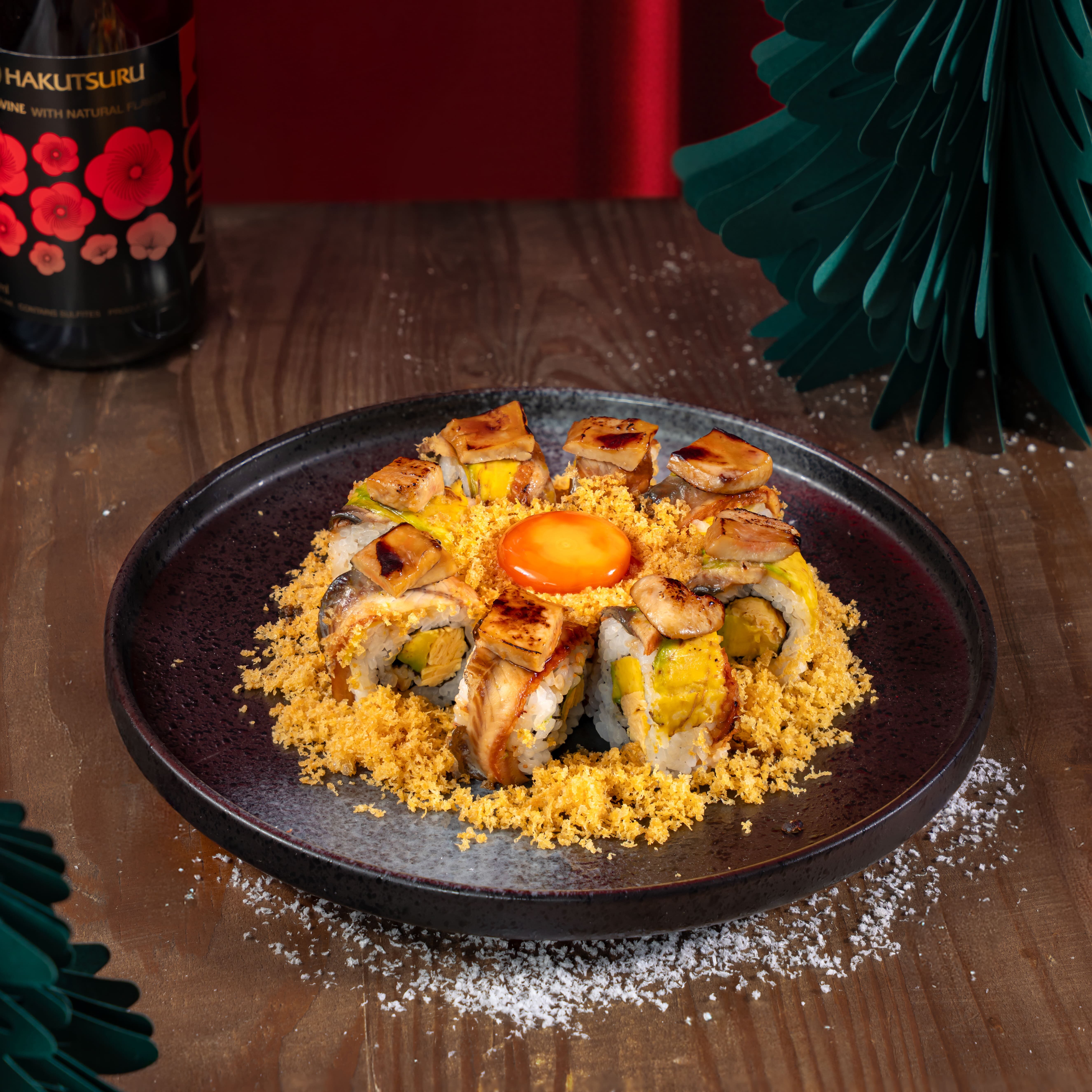 Maki cuộn phủ lươn Gan ngỗng Pháp đặc biệt: Sự kết hợp giữa vị ngọt đậm đà của lươn Nhật và độ béo ngậy của gan ngỗng Pháp tạo nên một trải nghiệm bùng nổ vị giác.