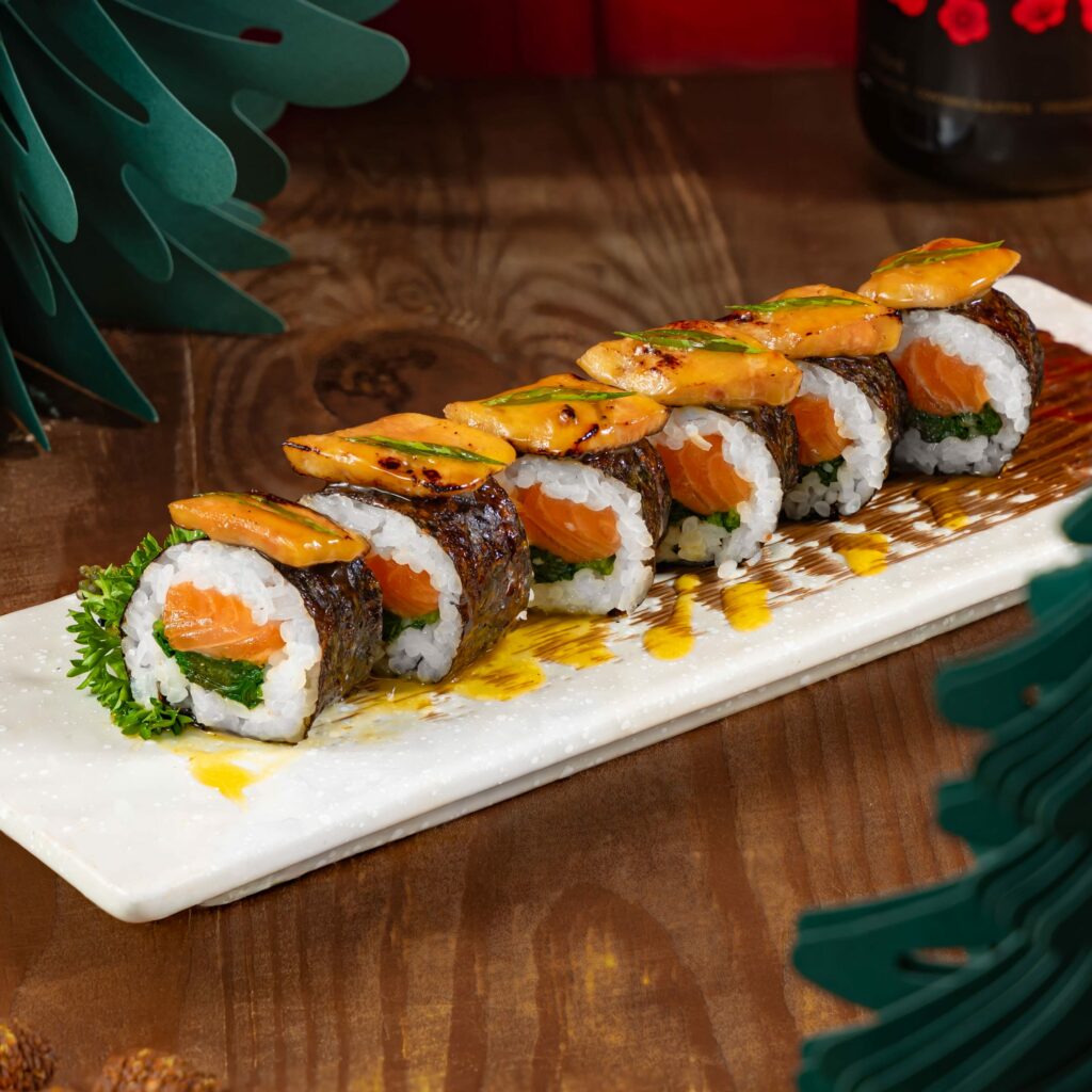 Maki cuộn cá hồi cải bó xôi phủ Gan ngỗng Pháp xốt chanh leo: Một sự sáng tạo mới mẻ với xốt chanh leo chua thanh, giúp cân bằng hoàn hảo độ béo, mang lại cảm giác nhẹ nhàng, tinh tế.
